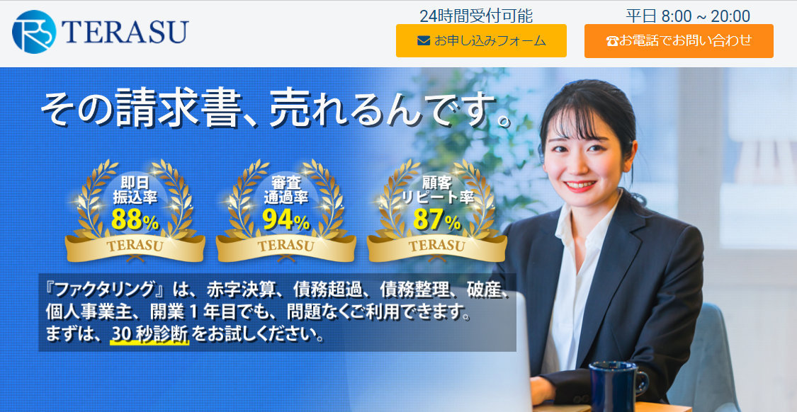テラス(terasu)ファクタリングは、2022年おススメのファクタリング会社です。30秒診断がテラスのリンクからお試しできます。